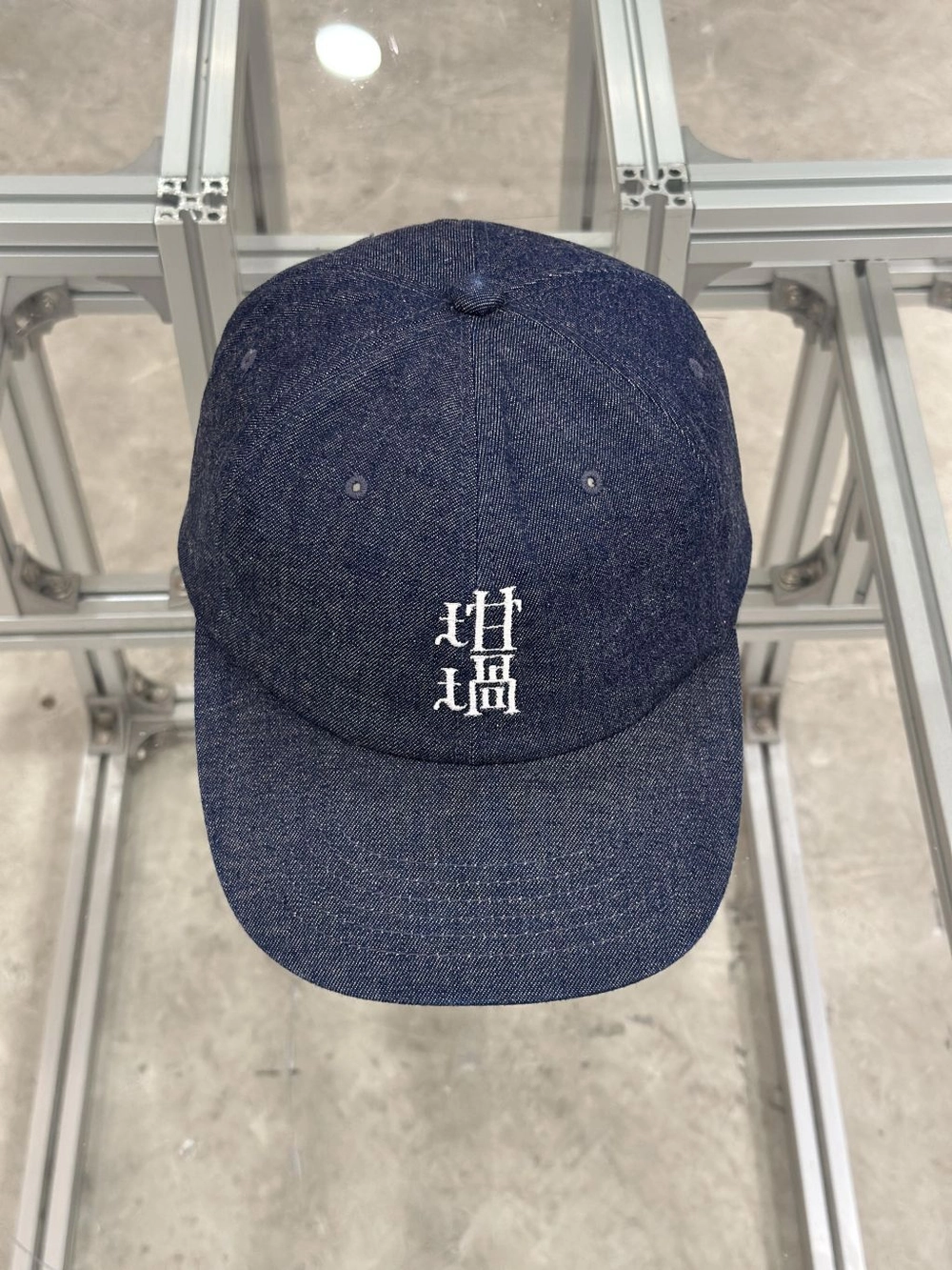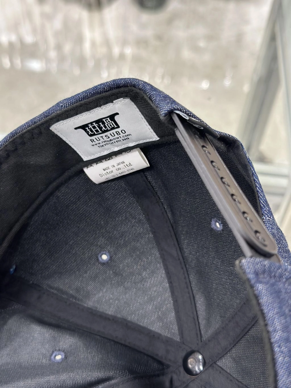 도쿄 기반 스트리트 브랜드 RUTSUBO의 데님 캡으로, 깊이감 있는 인디고 컬러와 전면에 새겨진 한자 자수가 인상적인 디자인입니다.
