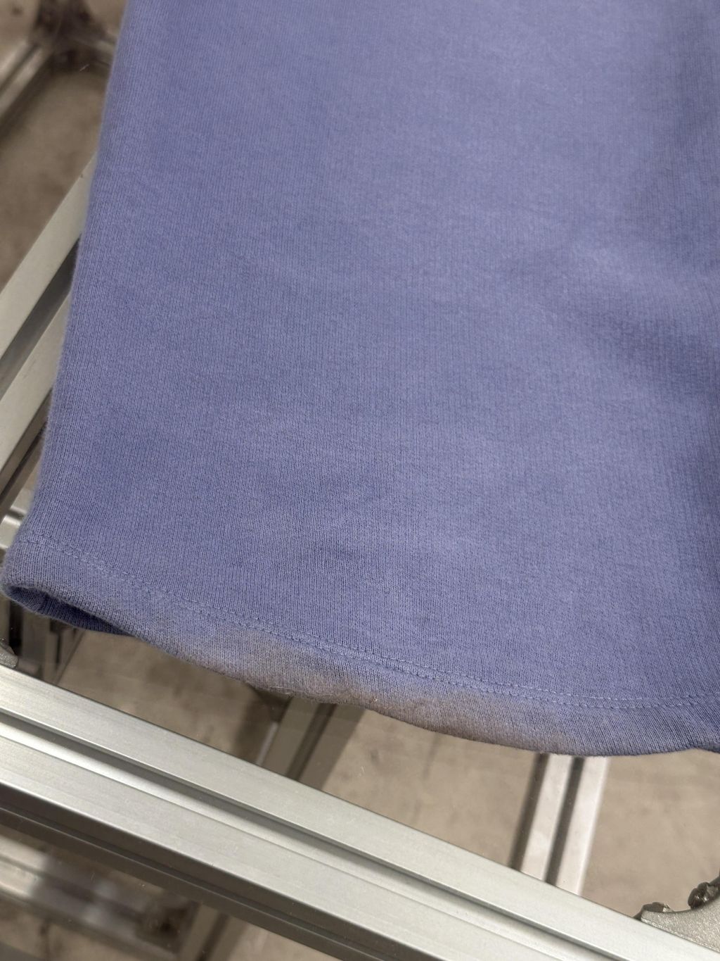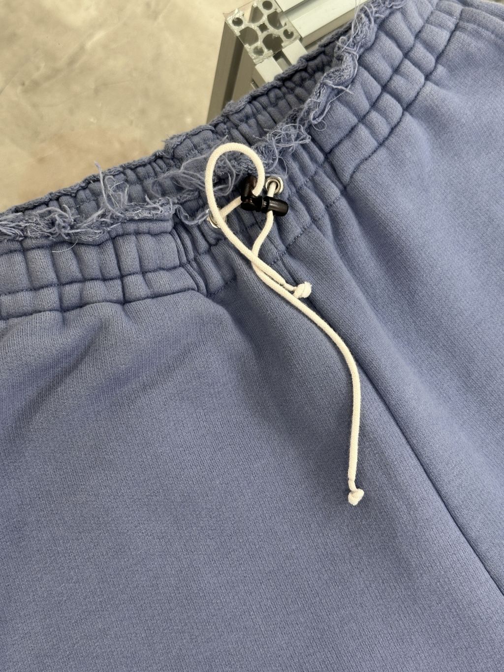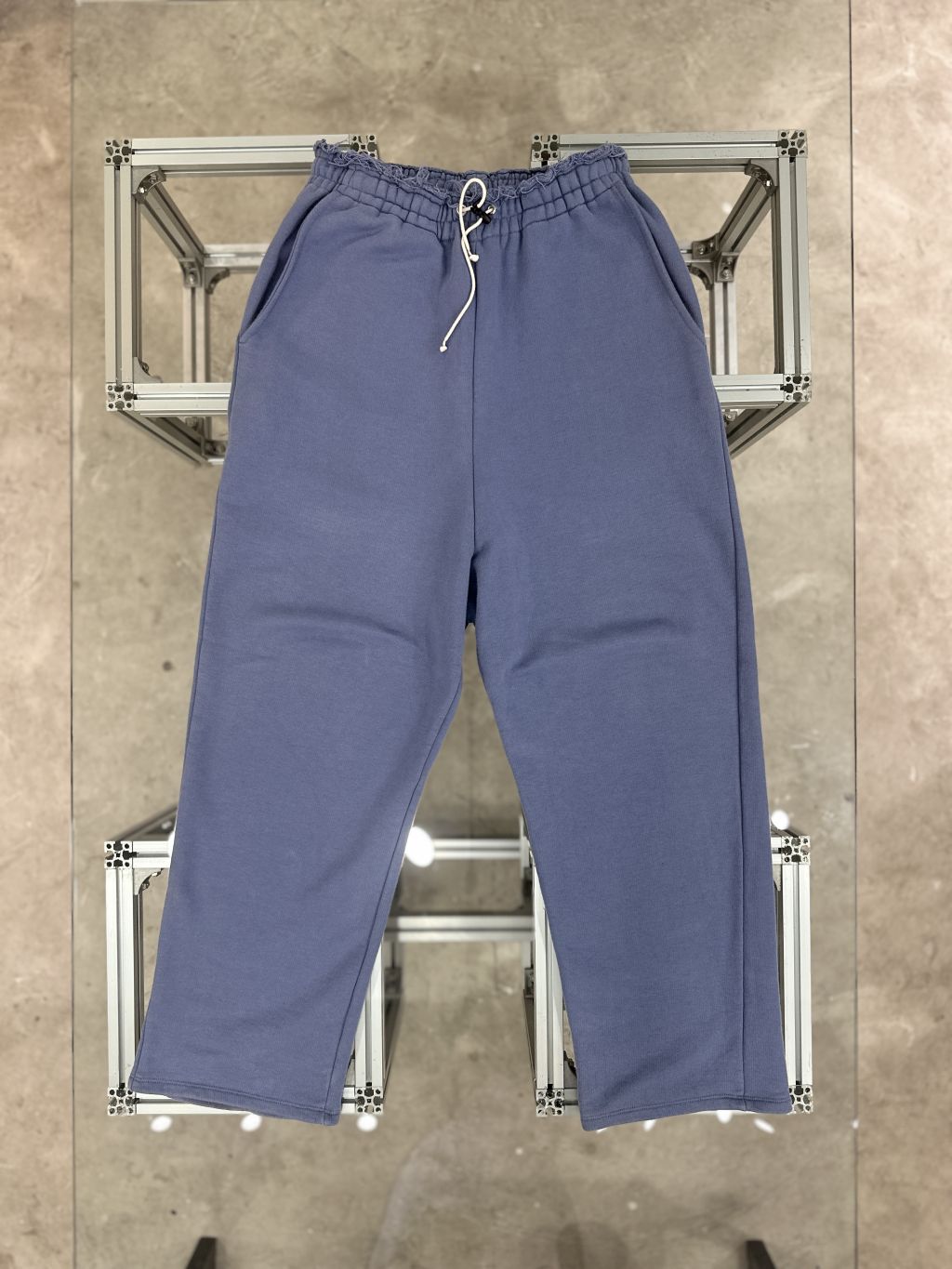 허리선에 거칠게 커팅된 프레이 디테일과 바랜 듯한 워시드 블루 컬러가 인상적인 스웨트 팬츠입니다.