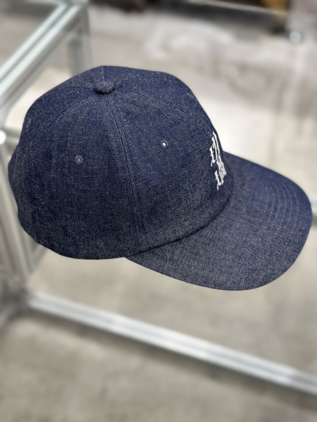 도쿄 기반 스트리트 브랜드 RUTSUBO의 데님 캡으로, 깊이감 있는 인디고 컬러와 전면에 새겨진 한자 자수가 인상적인 디자인입니다.