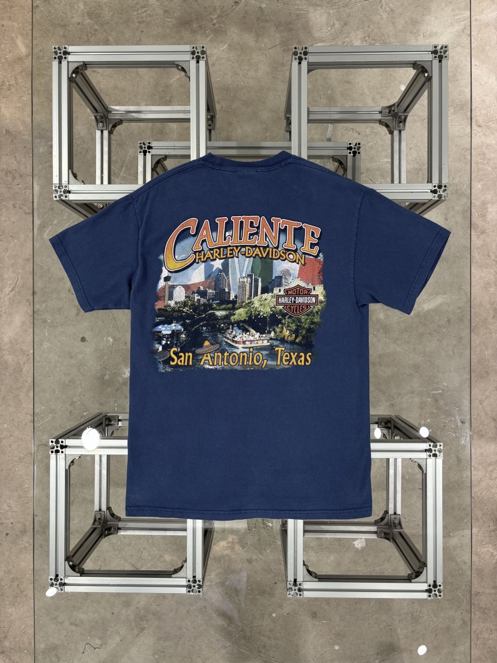 전면에는 톤온톤으로 새겨진 “SCREW IT, Let’s Ride” 텍스트와 클래식 로고가, 후면에는 San Antonio, Texas의 CALIENTE Harley-Davidson 그래픽이 프린트되어 있습니다. 빈티지 워싱 처리된 블루 컬러로, 두터운 코튼 소재가 특징입니다.