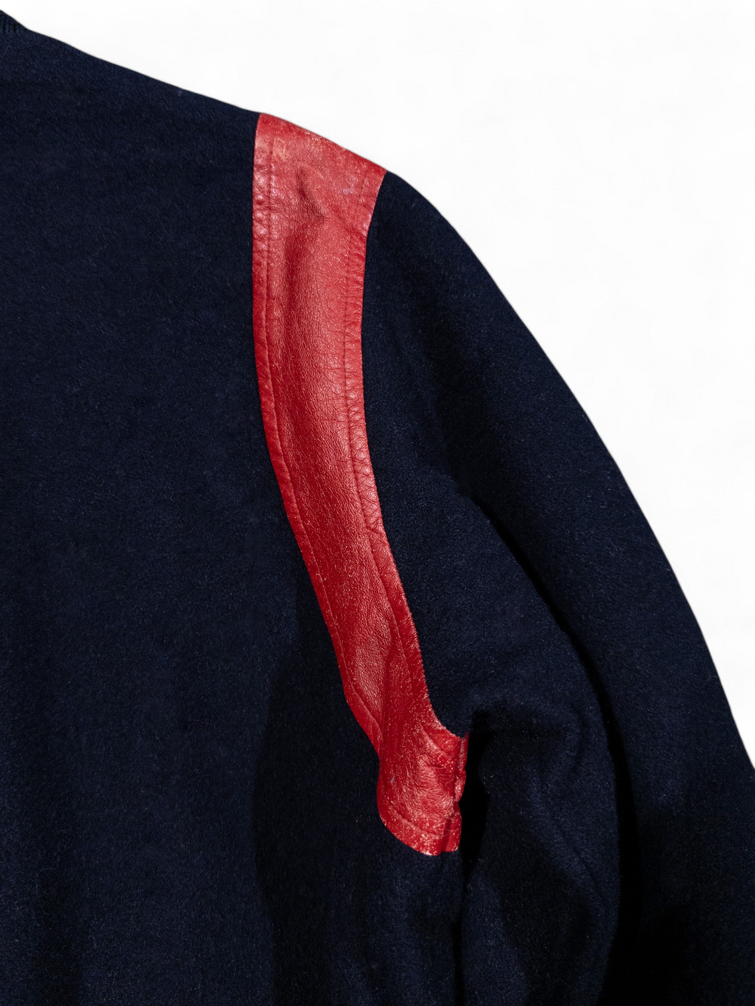 짙은 네이비 울 바디에 레드 레더 트림이 포인트로 들어가,