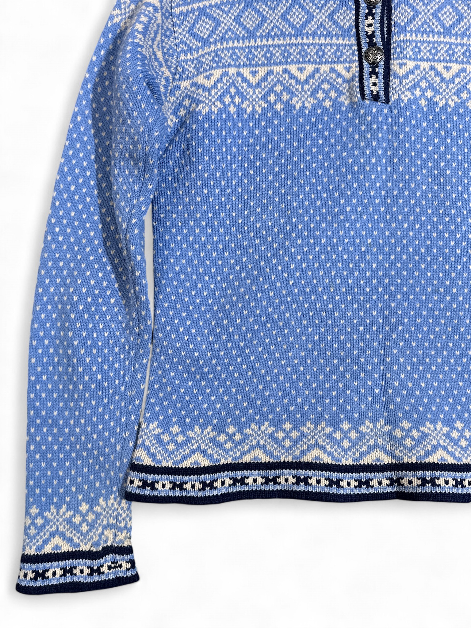 전면에 섬세한 페어아일 짜임과 빈티지 버튼 디테일이 특징이며,